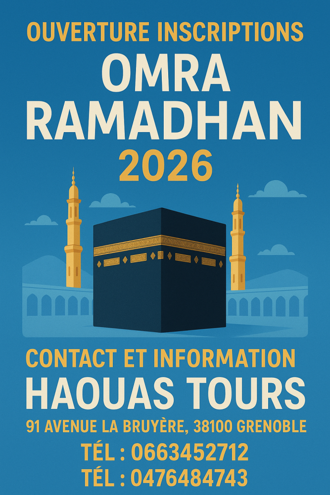 OM TOURS INTERNATIONAL > Actualités > Ouverture Inscriptions Omra Ramadhan Lundi, 15 septembre, 2025 Voir toute l'actualité Information et Insecriptions : 06 63 45 27 12 04 76 48 47 43